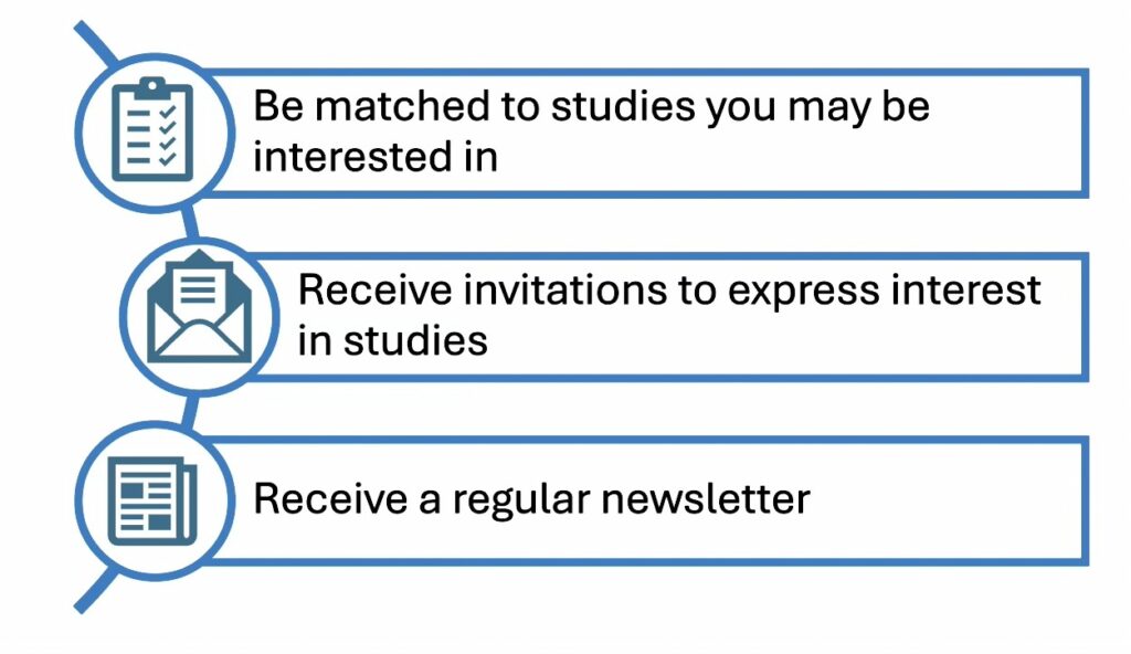 If you are interested in a study and want to find out more, you can register your interest and give permission for researchers from that study to reach out to you. Some studies may ask for some additional information to confirm whether you are potentially eligible to participate.